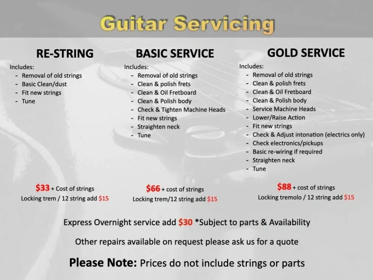 From a basic restring to broken necks, pickup replacement, re-wiring or complete setups we can sort you out!